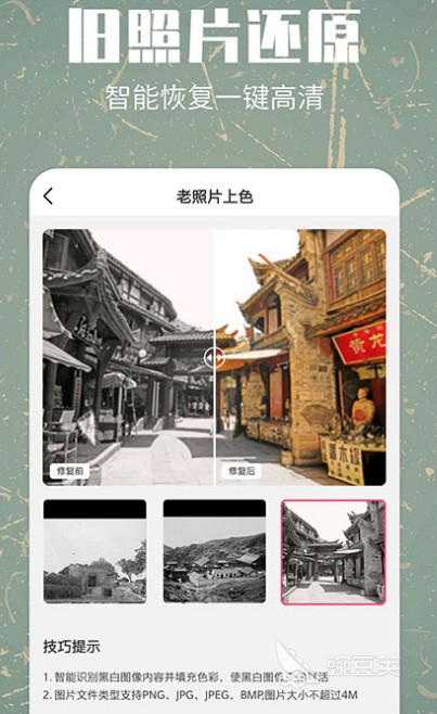 使用app修复照片前后对比完全不同,大部分优秀app当中有剪裁、旋转等多种模式,功能及其实用能够满足日常修图需求。可以为照片上色除雾降噪,各种实用功能,让旧照片焕然一新,这款应用有着专业可靠的技术,操作之后可提升照片质感,对于破损划痕污点以及严重被污染的照片都能够精准修复,还能对照片无损放大。