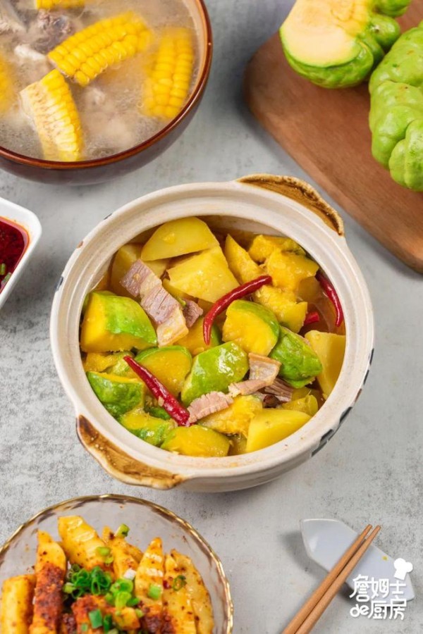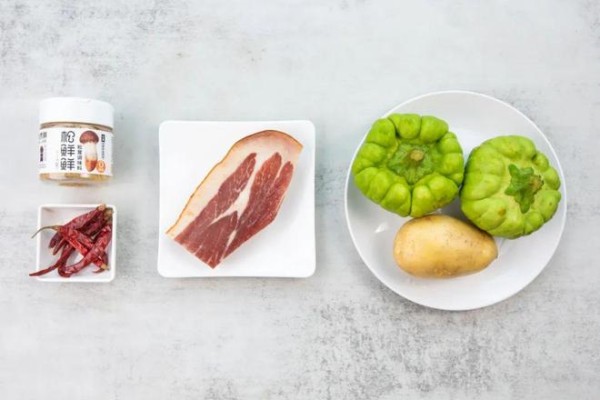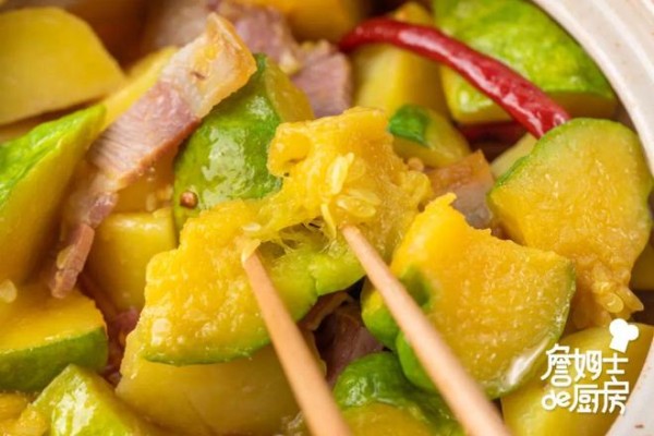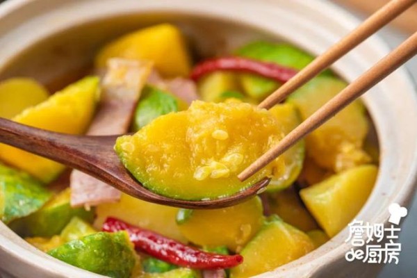 油热下干辣椒、火腿煸香,倒入姜柄瓜、土豆炒至断生,加适量调味后,倒入热水,中火焖煮20分钟。