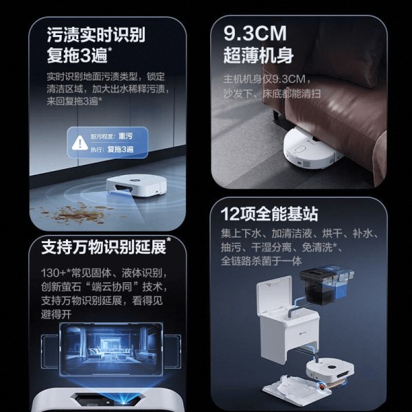 强大清洁覆盖:一次充电可以轻松覆盖140㎡以上的区域,确保家中每个角落都能得到完美清洁。无论是客厅还是厨房,代替传统清洁方式,让清扫变得更加高效便捷。 智能化操控体验:通过APP轻松实现远程控制,让清洁工作更具灵活性。只需在手机上简单点击,随时随地启动或监控清洁进程,享受科技带来的便利。 出色的污渍处理能力:凭借创新的洗地技术,即使是复杂的干湿混合污渍也能轻松应对。特有的高温水流洗净系统,有效剥离顽固污垢,让地面焕然一新。 全方位自动维护:搭载恒净基站设计,免去频繁清洗的麻烦,保证内部环境的洁净。省心的清洁方案,让用户更专注于其他生活中的乐趣,而不必担心保养问题。 灵活机身设计:超薄的机身能轻松穿梭于沙发和床底等难以到达的地方,高效清理死角垃圾。这种周密构思确保了每一次清扫都无遗漏,让整体空间始终保持干净舒适。