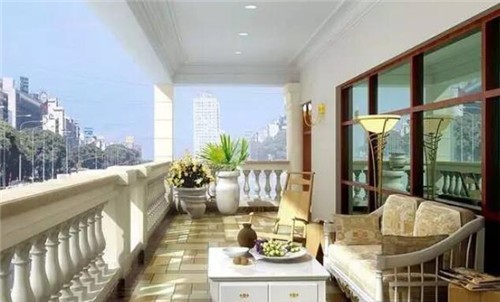 阳台的装饰还要从家里的装修风格出发,这样才会有突兀的感觉。比如说室内格调是欧式的,那么阳台的设计也应该是欧式的。图中便是一个欧式格调的阳台,主人在阳台上摆上美观、舒适的沙发和雅致的茶几,既可以在阳台上欣赏风景,也可以在这样会客。