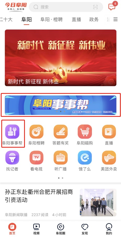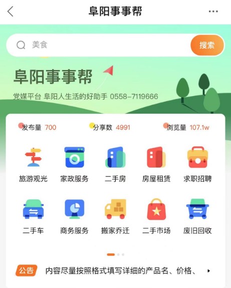 ①下载今日阜阳客户端,首页“阜阳”频道下的服务模块第一个即为阜阳事事帮,点击即可进入;