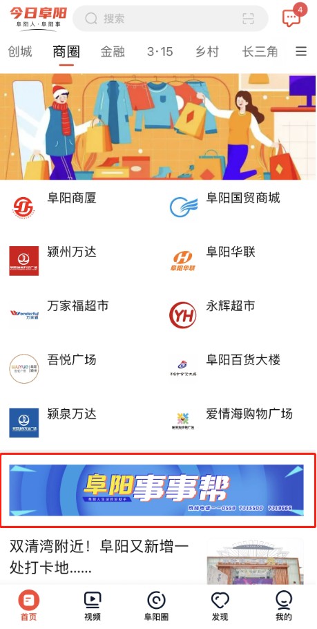 ③也可以滑动到“商圈”频道,点击下面的广告横幅阜阳事事帮也可进入。