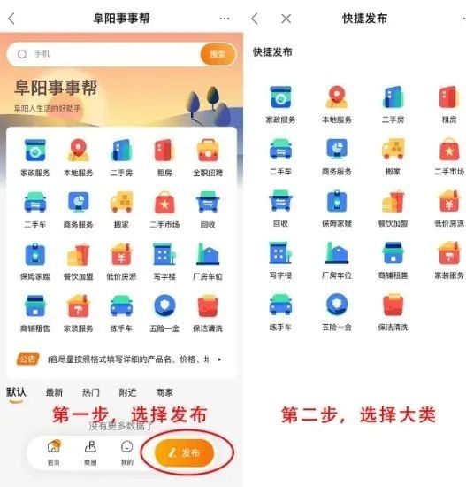 ①进入今日阜阳客户端后,首先登录客户端;然后进入阜阳事事帮主页,点击右下角发布按钮,进入信息发布页面。