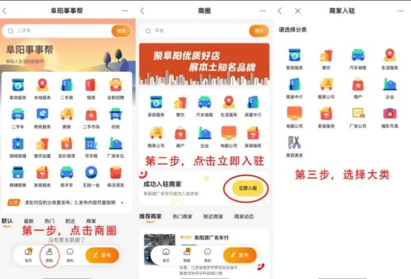 ①同样需要首先登录客户端,再点击阜阳事事帮主页底部商圈,进入商圈界面。
