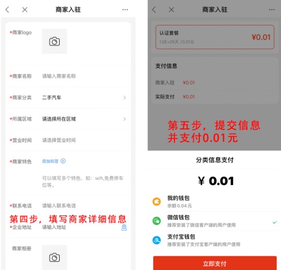 ④填写商家名称、logo、联系方式、营业执照、身份证等信息后,支付0.01元后提交审核即可。