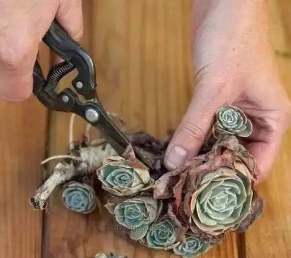 1.将多肉植物茎部保留1-2英寸,将底部的叶片扒去,这样有利于之后根茎从扒去叶片的叶节点出长出。在种植时,先将剪下的待种植物放在托盘中两三天,有点蔫没关系,这样有利于修剪的伤口复原,减少后期伤口腐烂的可能性。