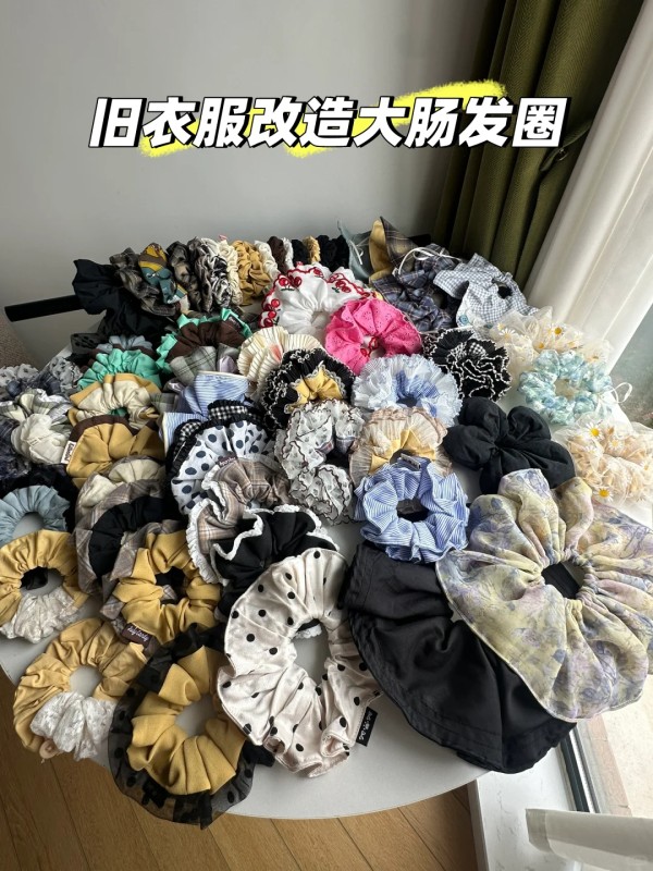 闲置的衣物(如牛仔布、连衣裙、棉质衬衫)可以改造成大肠发圈。只需将布料裁剪成长条,缝合成环状并套上橡皮筋即可。手艺好的朋友还可以添加蕾丝、刺绣等装饰,让发圈更具个性。改造后的发圈不仅自用合适,还能作为小礼物送给朋友,甚至摆摊售卖增加收入。