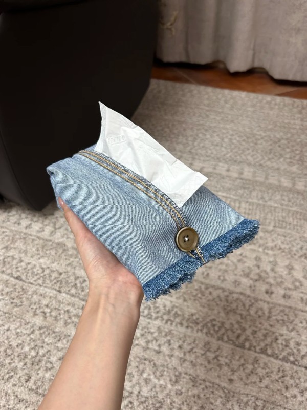 不穿的牛仔裤裤腿可裁剪成纸抽盒。利用裤腿侧面边线作为抽纸位置,中间裁剪开并固定,再将裤腿两边缝好并装上扣子。改造后的纸抽盒既方便装纸,又能作为桌面装饰,让生活充满小趣味。