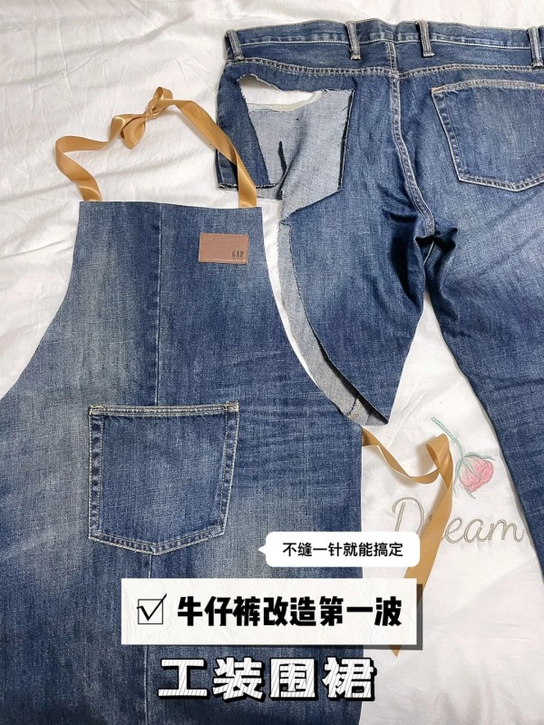 不穿的牛仔裤可裁剪成围裙形状,利用其他布料制作绑带固定,再将裤兜拆卸后缝在围裙中间。改造后的牛仔围裙既耐用又实用,适合烹饪时使用,还能让厨房多一份个性。