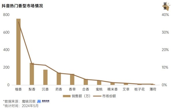 抖音的主流香型是梨香、檀香和沉香,占据2/3的市场规模,主打安神助眠、驱蚊除菌等功效;而紧随其后的桂花、蜜桃等花香则主打空气净化功效。
