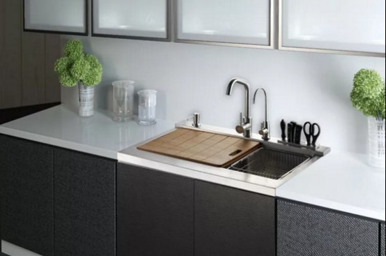 2、水槽清洁:水槽的清洁也是清洁橱柜时的一个重要问题,清洁水槽的同时,也要记得把滤盒后面的管部清洗一下,避免长时间堆积的油垢积累,等堵住或者发现其他问题的时候,清理起来更加麻烦。如果水槽内有顽固油渍,可以用厨房专用去油渍的清洁剂,之后用热水冲洗,再用冷水清洗。