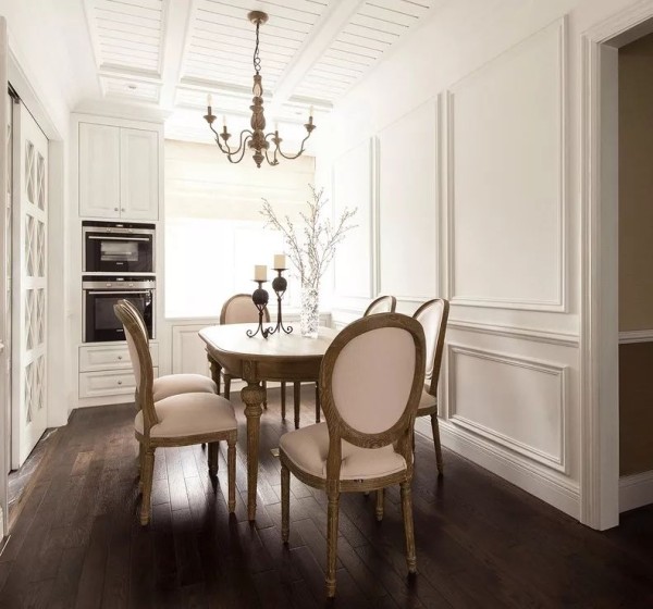 建议餐桌椅选择木质的,即使沾到油污,也能很轻松的完成清洁工作。当然,皮质的餐椅也是可以用的。