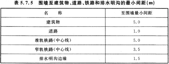 5.7.5 厂区围墙的结构形式和高度应根据企业性质、规模以及周边环境确定。围墙至建筑物、道路、铁路和排水明沟的最小间距应符合表5.7.5的规定。