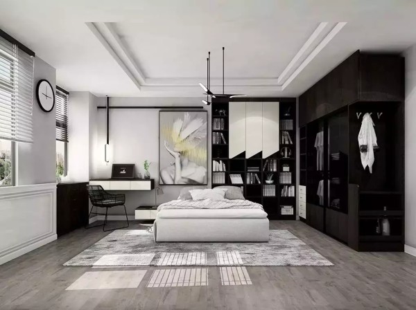 深灰色及黑色为主,以白色床头柜及枕头点缀,酷感十足。