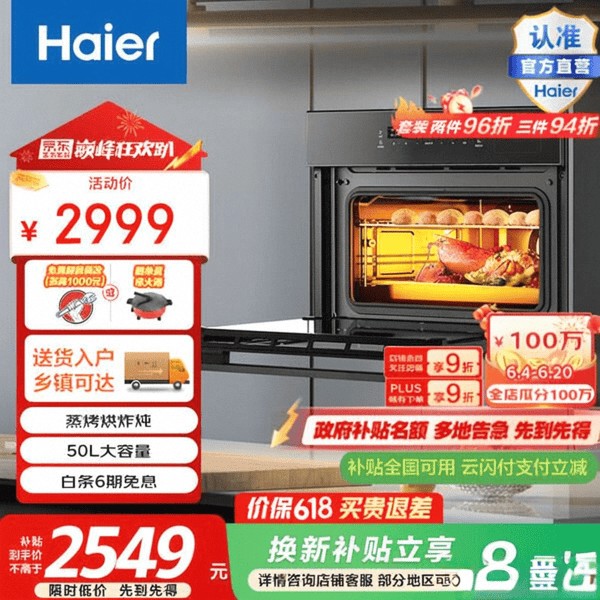 六、海尔嵌入式蒸烤箱 蒸烤一体机 50L大容量蒸烤烘炸炖五合一干粉搪瓷/不锈钢内胆水汽循环不串味以旧换新