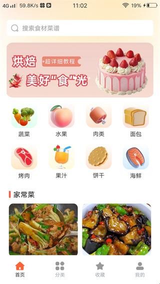 2、打开app,首页美食分类清晰如画,蔬菜的清新、水果的甘甜、肉类的醇厚各类食材分类跃然眼前。