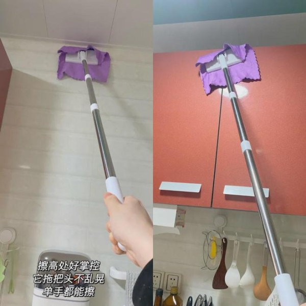 高处的柜门,把鱼鳞布卡在小拖把上,让拖把杆充当我们的手臂延长线。
