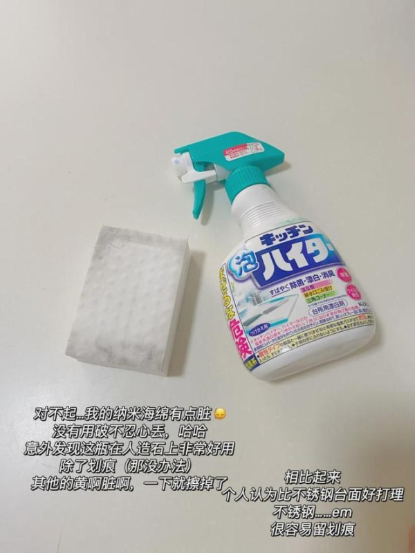 白色台面有点印子就很明显,泡沫先喷在有印子的地方,等几分钟,纳米海绵就着泡沫上手擦,新鲜的印子几下就擦下来了。