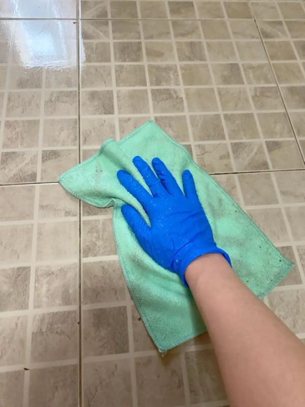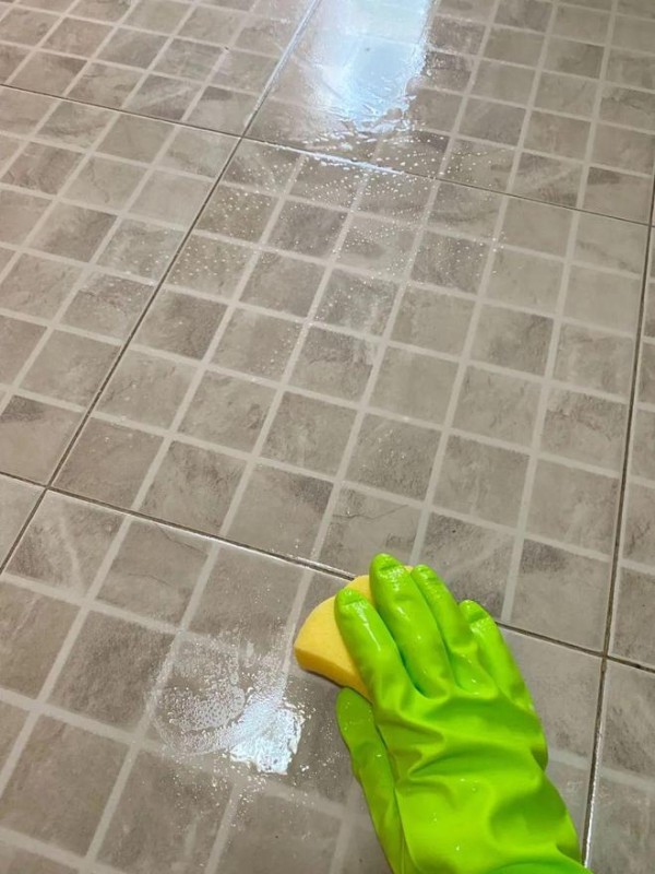 用湿的海绵打圈擦拭地砖,砖缝间稍微用点力。