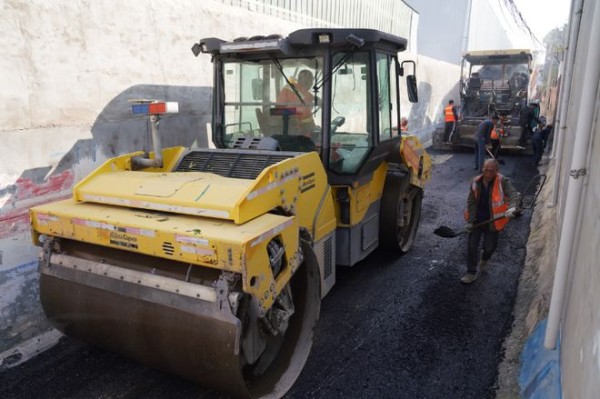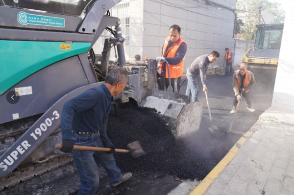 10月27日,在西安市临潼区雨金街道东关村,压路机、摊铺机等大型机械开足马力,施工人员正在紧张开展沥青路面摊铺作业,现场一派热火朝天的景象。