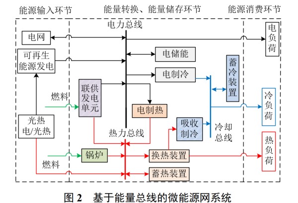 根据微电网或微能源网是否与主电网相连接,可将其分为并网型和独立型 2 种。本文以并网型微 能源网为研究对象,研究其并网运行的能量管理与优化问题。目前,针对微能源网的能量管理,从算法上来讲,多结合最优化算法或者启发式算法进行。文献[3]建立了微网混合整数非线性模型,通过将其分解为组合问题和最优潮流问题,避免直接求解混合整数非线性问题,加快了寻优速度。文献[4]通过概率约束对旋转备用储能的不确定性进行建模,提出了一种使用机会约束规划来最小化微网运营成本的最优调度方法。文献[5]在考虑可再生能源随机性和用户满意度的情况下,热电解耦的同时通过基于概率约束规划法优化,使运行成本最低。文献[6]提出一种基于记忆机制的遗传算法,对微网运行成本最小化问题进行求解。文献[7]提出了一种新的混合粒子群优化算法对含有可再生能源的微电网进行优化。文献[8]在考虑符合满意度的基础上,利用 NSGA-II 算法对微电网运行进行多目标优化。文献[9]基于 Stone-Geary 函数和双向拍卖机制构建了智慧能源系统能量优化模型,给出了通过收敛判定域引导的全局随机寻优与区域定向寻优策略。最优化算法的计算效率较高,但是其在处理非线性、非凸或非连续问题时难以逃出局部最优。启发式算法可以在给定的条件下求得相应的最优解或 Pareto 前沿,但限制多,计算耗时长且算法泛化学习能力不足。