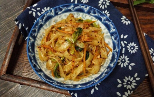 4、就着锅里剩余的油下葱白小火煸香,然后再加入切丝的胡萝卜,炒至胡萝卜微软,下沥水的刀削面,再加入生抽炒匀