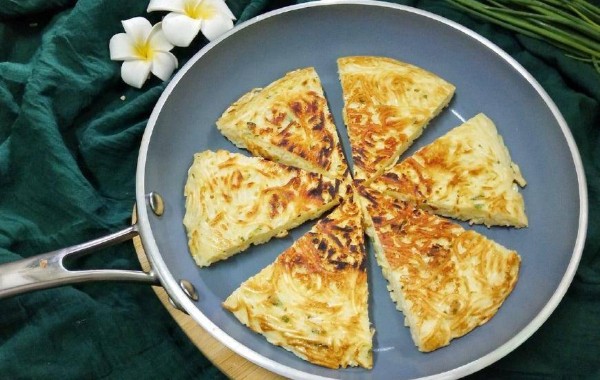 3、把平底锅里倒入少许食用油,把拌匀的鸡蛋面条倒入锅中摊平小火煎至两面金黄,出锅,可以配上自己喜欢吃的辣酱或者是番茄酱