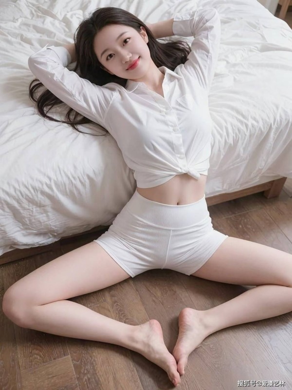 在这张照片中,一位女性以一种轻松而自然的姿态出现在画面中。她穿着一件白色的长袖衬衫和一条白色的紧身短裤,整体造型简洁而时尚。衬衫被巧妙地打了一个结,露出了平坦的小腹,增添了一份俏皮和性感的气息。她的双腿自然地分开,坐在木质地板上,脚尖微微翘起,显得既随意又优雅。