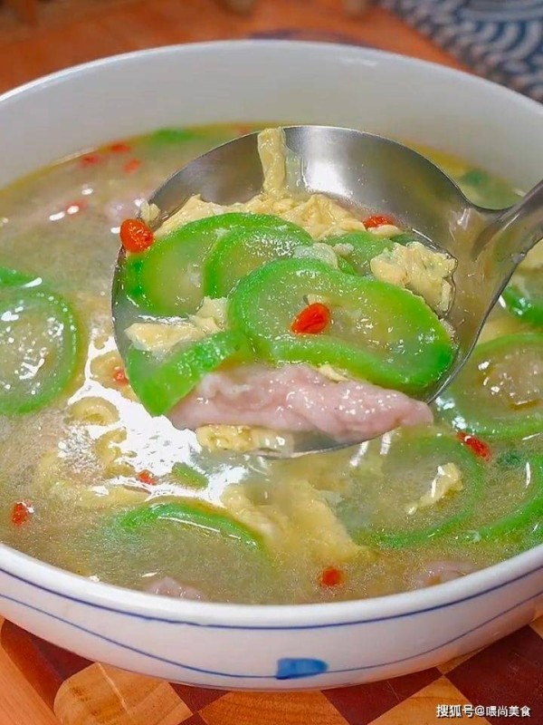3、肉片下锅后重新开火,将水再次煮开,放入切好的丝瓜,淋入鸡蛋液,撒上枸杞和葱花,即可出锅。这样做出的丝瓜滑肉汤,汤鲜味美,营养丰富。
