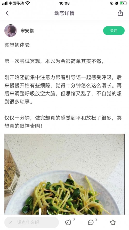 “第一次尝试冥想,本以为很简单却发现并没有那么简单。不过,仅仅十分钟,做完就感觉到了久违的放松,冥想真的很神奇。”