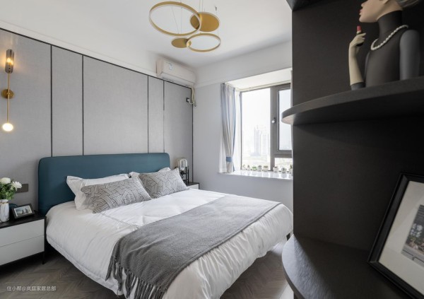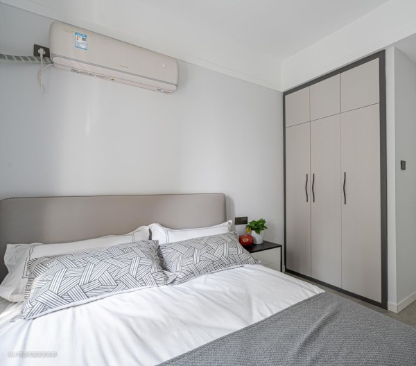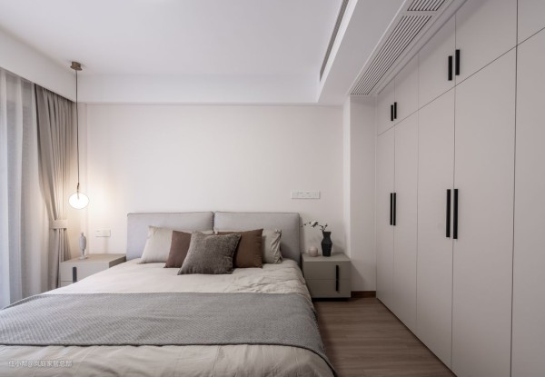 在床侧做了一组嵌入式的到顶衣柜,浅灰色的柜子,跟软装家具的色彩契合。简单大气的色彩,是现代风里不可或缺的重要元素之一。