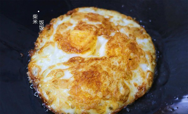 1,锅里加少许油,打入3~4个鸡蛋。中小火将鸡蛋煎至两面金黄,内部熟透盛出,再切成小块。