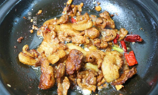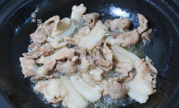 2,砂锅倒入少许油,放入猪肉,中火煸炒出多余的油脂。