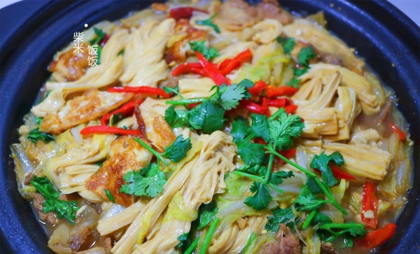 6,白菜炖熟,放入鲜腐竹。然后加盐、酱油调味,翻炒均匀。