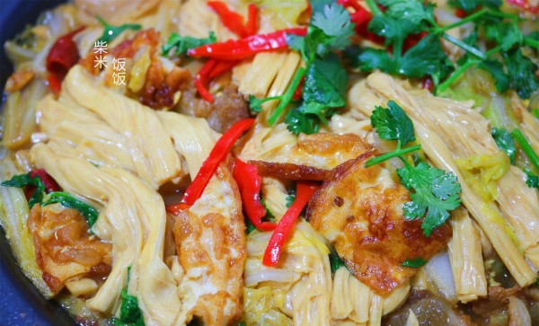 【食材】大白菜、鸡蛋、腐竹、葱、姜、蒜、干辣椒、红椒、香菜、老抽、酱油、盐、五香粉