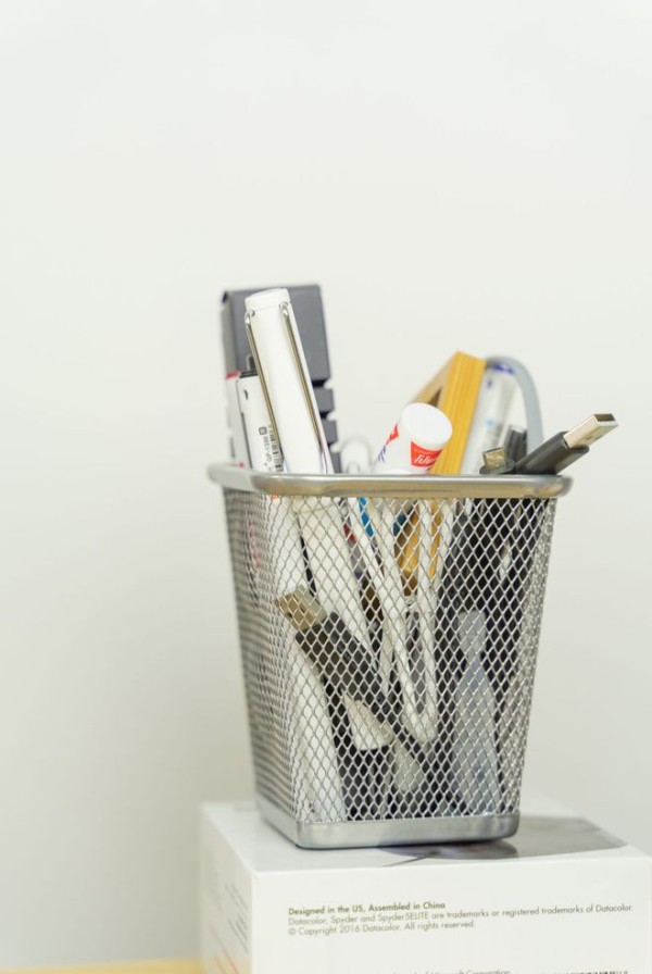 另外的两款桌面配件,则是一个木头的小鲸鱼手机支架和一个宜家的金属网笔筒。手机支架嘛,自然是把手机倾斜放在桌面,看消息方便点。而其他一些零零散散的小物件,全都丢笔筒里面去了,比如数据线、签字笔。