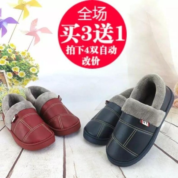 冬天中老年包跟棉拖鞋男女加厚保暖鞋防水防滑PU皮棉鞋居家情侣鞋