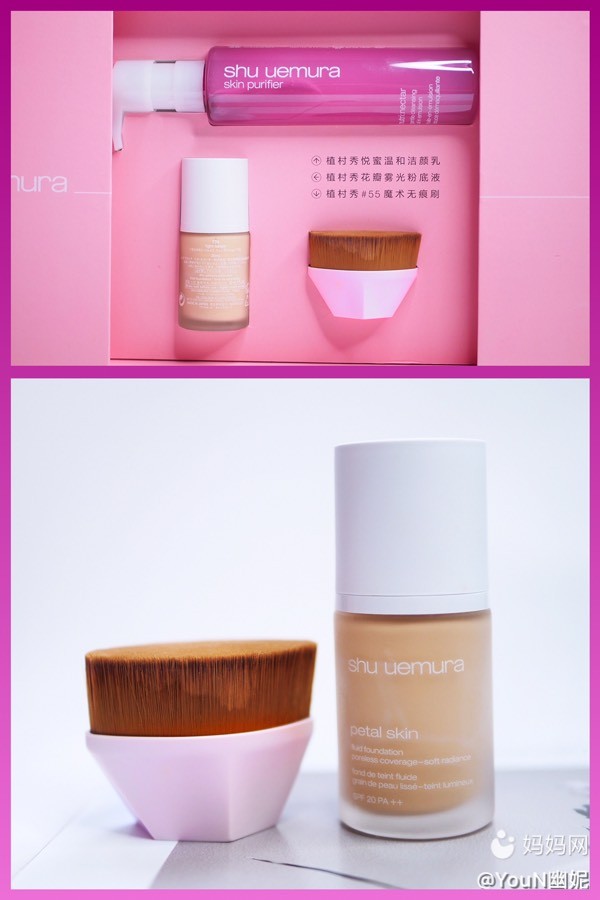 礼盒里有一瓶质地很清爽温和的植村秀巴西莓果洁颜露,还有一支植村秀花瓣雾光粉底液,和一个我长草了很久的55号魔术无痕刷,还是限量版千禧粉的~~比常规版的可要好看多啦,开心~~