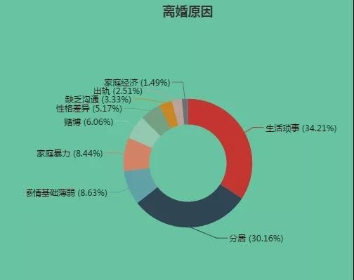 其中,有34.21%的离婚纠纷因生活琐碎而造成!30.16%因分居而造成感情基础薄弱成为造成离婚的第三大原因。家庭暴力、性格差异、缺乏沟通等等都是造成离婚的因素。