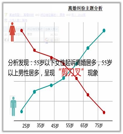 提出离婚的25岁之前女性占了大头,30岁以后男女逐渐接近。到了55岁以上则是男性居多,呈现出一种“剪刀差”现象。