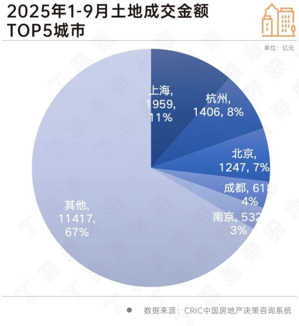 土地方面,目前下行趋势已基本止住,成交金额比去年还有所上升。2025年1-9月,全国300城土地成交总金额中,上海、北京、杭州三城合计占比达27%,市场集中度进一步提升。房企拿地仍高度谨慎,聚焦核心城市优质地块。