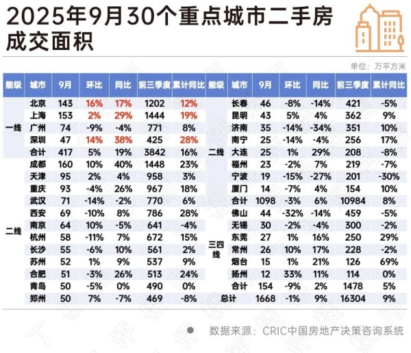 从二手房来看,30个重点城市二手住宅成交面积连续第六个月环比下降,多数城市同环比双跌。北京、上海、深圳等一线城市,在新政效应带动下市场热度延续,但增长动能放缓,政策托底效果有限。