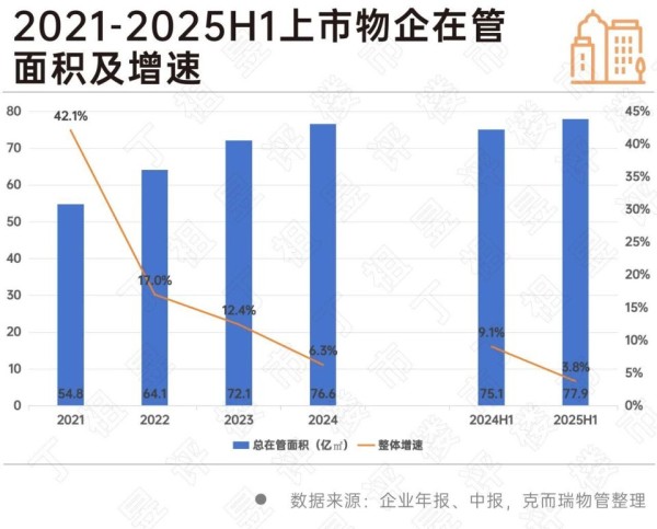 物业虽然增速放缓,但还是保持增长,物业企业正主动调仓。截至2025年上半年,43家披露合约面积的企业总合约面积63亿平方米,同比增速为0.5%;53家上市物企在管面积合计77.9亿平方米,同比增长3.8%。这标志着物业行业已告别高速扩张期,进入存量深耕阶段。