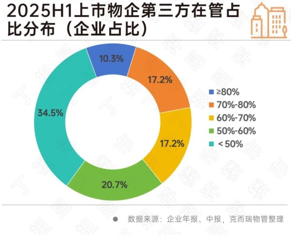 截至2025年上半年,披露数据的29家上市物企第三方在管面积占比为65.0%,与上年同期基本保持一致。29家企业中,有37.5%的企业第三方在管面积占比超过了70%,其中绿城服务和雅生活服务的表现尤为突出,第三方在管面积占比均超过80%。尽管市场整体增长趋于平稳,但领先企业依然能够通过强大的外拓能力实现高于行业平均水平的增长。