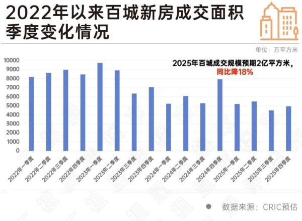 根据克而瑞预测,2025年四季度百城新房成交环比有望增长10%,但全年成交规模预计为2亿平方米,同比下降18%。这表明尽管短期政策刺激带来一定回暖迹象,但市场需求仍未完全释放,购房者观望情绪仍存,市场尚未走出底部。