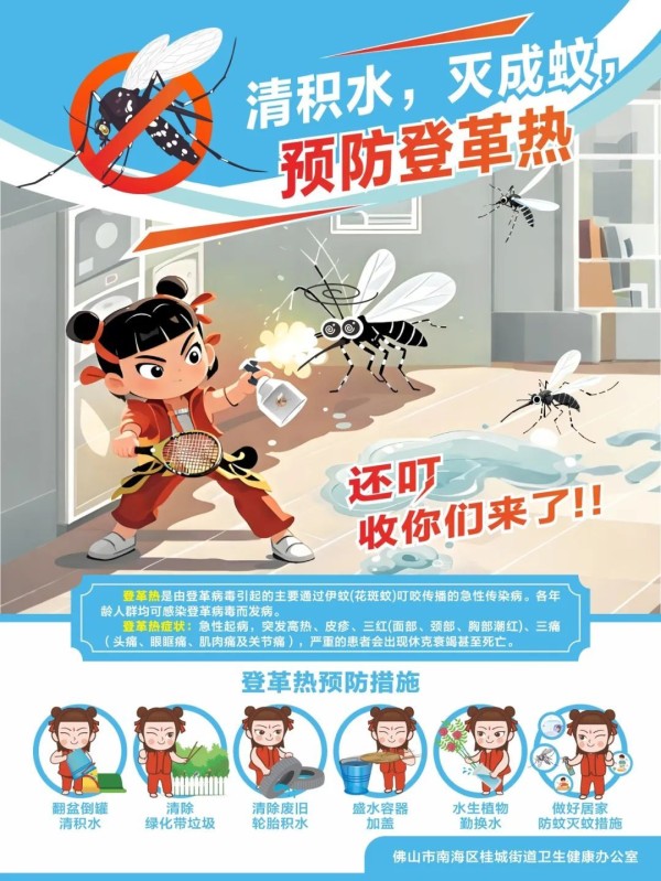 随着近期气温升高和雨水增多,我市蚊虫已进入快速繁殖期。及时彻底清除积水、加强防蚊灭蚊是预防登革热等蚊媒传染病的关键措施。为有效降低蚊媒密度,共同营造干净整洁、健康舒适的生活工作环境,结合第37个爱国卫生月活动及十五运会和残特奥会佛山赛区赛事的举办,我们提出如下倡议: