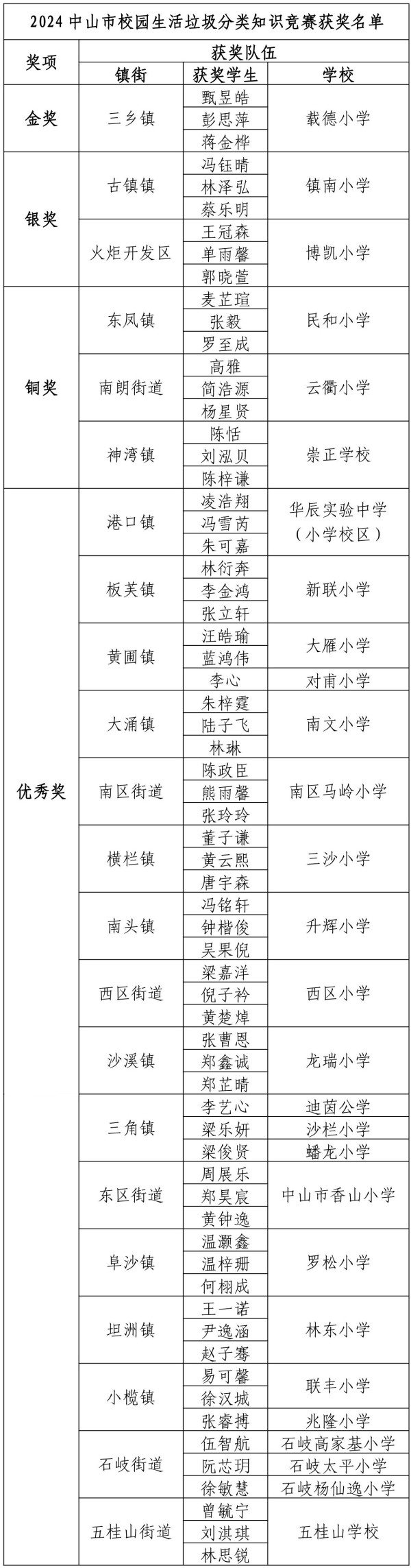 附:2024中山市校园生活垃圾分类知识竞赛获奖名单