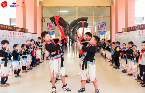 南丹王尚小学白裤瑶学生在进行非遗表演。