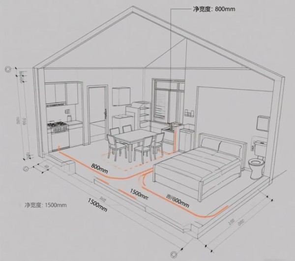 合理规划行为流线:厨房到餐厅、卧室到卫生间等日常频繁通行的路线,净宽度不应小于 800mm,确保轮椅和助行器能够顺利通过;若路线上存在交叉或转折,转弯半径宜不小于 1500mm ,方便老人灵活转向。