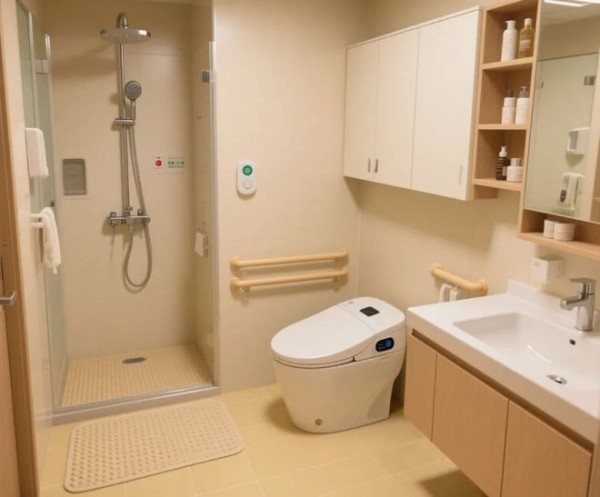 ·便利性需求:安装可移动的淋浴喷头,方便老人坐着淋浴;在合适位置安装紧急呼叫装置,一旦发生意外能及时通知家人或照护者。
